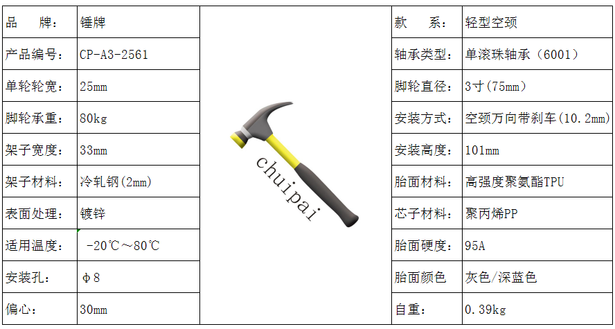 3寸轻型空颈TPU万向带刹车脚轮产品详情